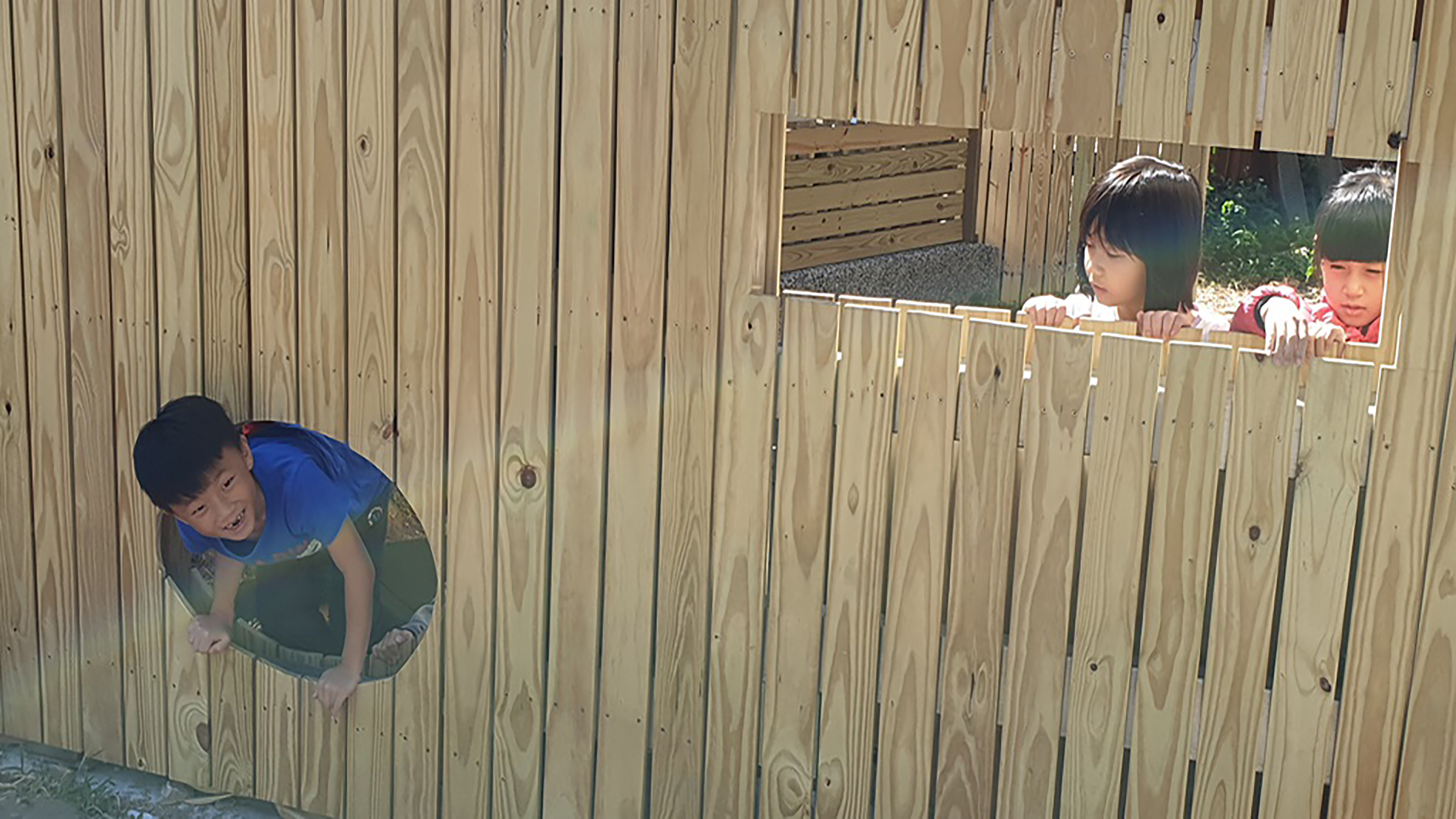 「秘境穿越、美感乍現」作為瑞梅國小的校園美感環境再造主題,規劃了「洞動吧!孩子」、「悠遊樹海」、「浮光掠影」三個遊戲場域,並結合學校閱讀及綠能生態教育等課程,落實日常活動中對美的欣賞,強化孩子多元感知、想像、判斷力與審美觀。「洞動吧!孩子」是利用木柵改造變電箱外觀,軟化校園角落生硬的景觀障礙,並融入遊樂設施,孩子可以自由穿梭各式圓型、方形的圍籬洞口,從不同的角度窺探神秘洞穴,猶如孩子們的秘密空間,是培養好奇心和探索精神的三度空間遊戲場域,同時兼顧肌肉訓練與肢體伸展,強化孩子們的體適能活動。