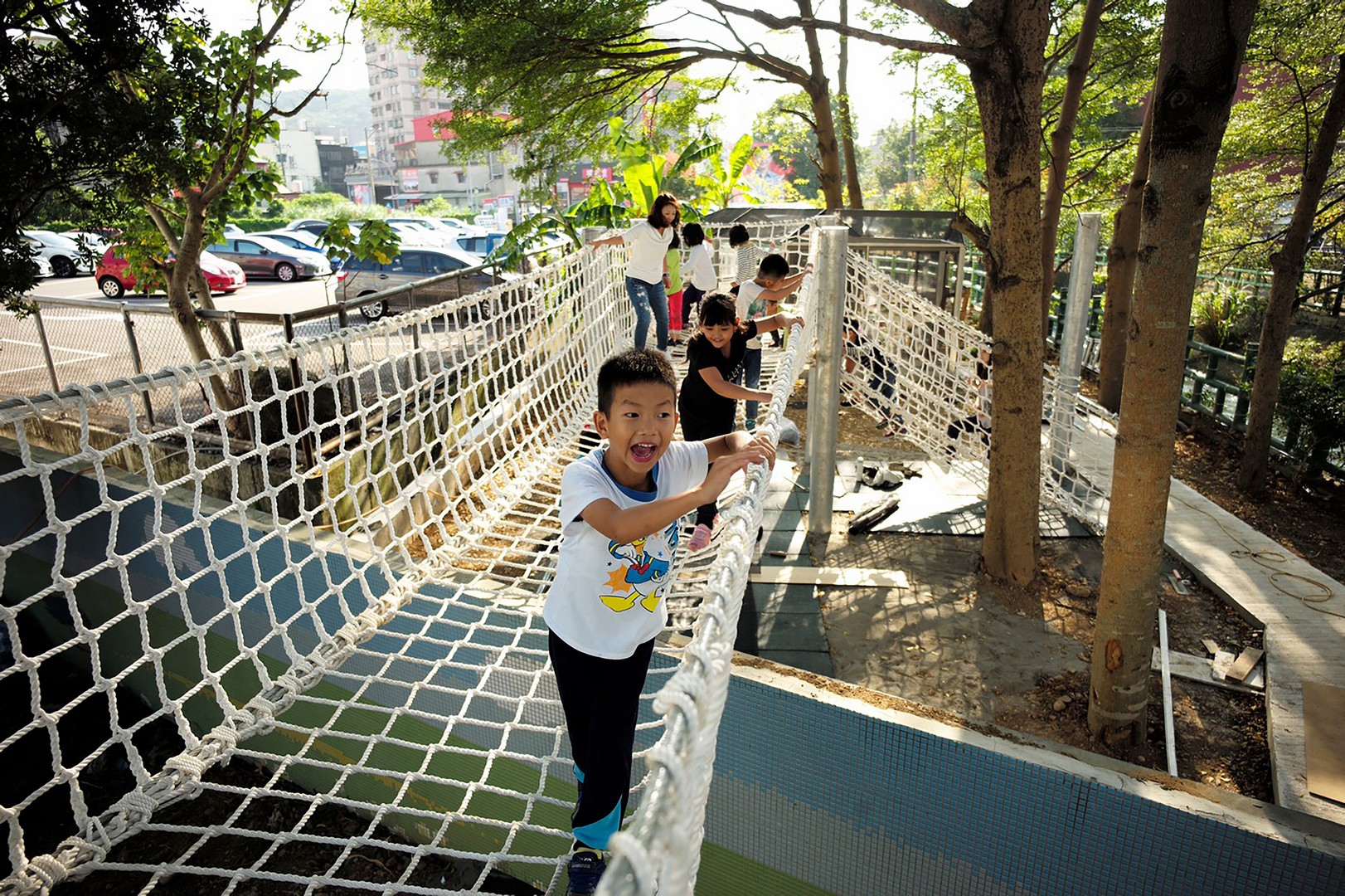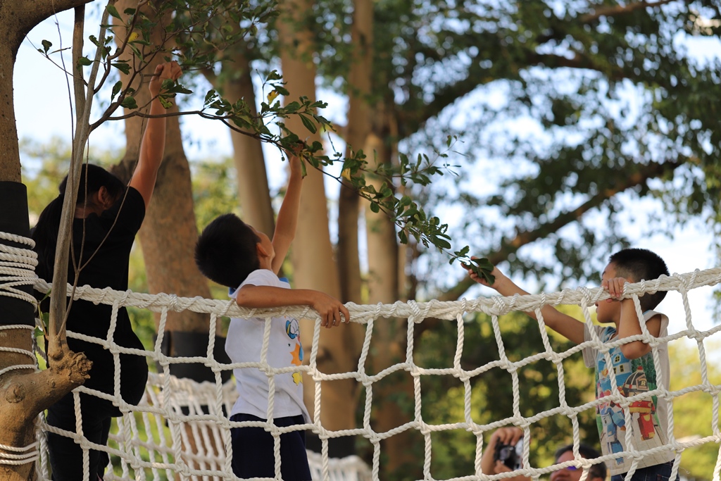 學校在進行校舍和新圍牆重建工程時,將圍牆外成為死胡同的校地重新收回,這片校地有生長高聳的欖仁樹林,考慮到學生不易親近樹叢,為此校方在樹林間設置了攀爬網,創造登高望遠的「悠遊樹海」場域,學生能夠自由穿梭於欖仁樹群俠。以尼龍繩編織的攀爬網,一路串連到欖仁樹群末端,途中更穿越了學校圍牆,孩童透過攀爬網展開探險之旅,擁抱樹幹與觸摸樹梢,進入樹海觀察大樹生態,欣賞婀娜多姿的樹影,成為自然課的活教材。攀爬的同時也能鍛鍊學童的肢體配合靈敏度,於林間享受蟬鳴鳥聲與陽光穿透樹梢的光影變化,並從制高點瞭望石門大圳的波光閃爍,在微風中感受乾淨明亮的歷史軌跡。