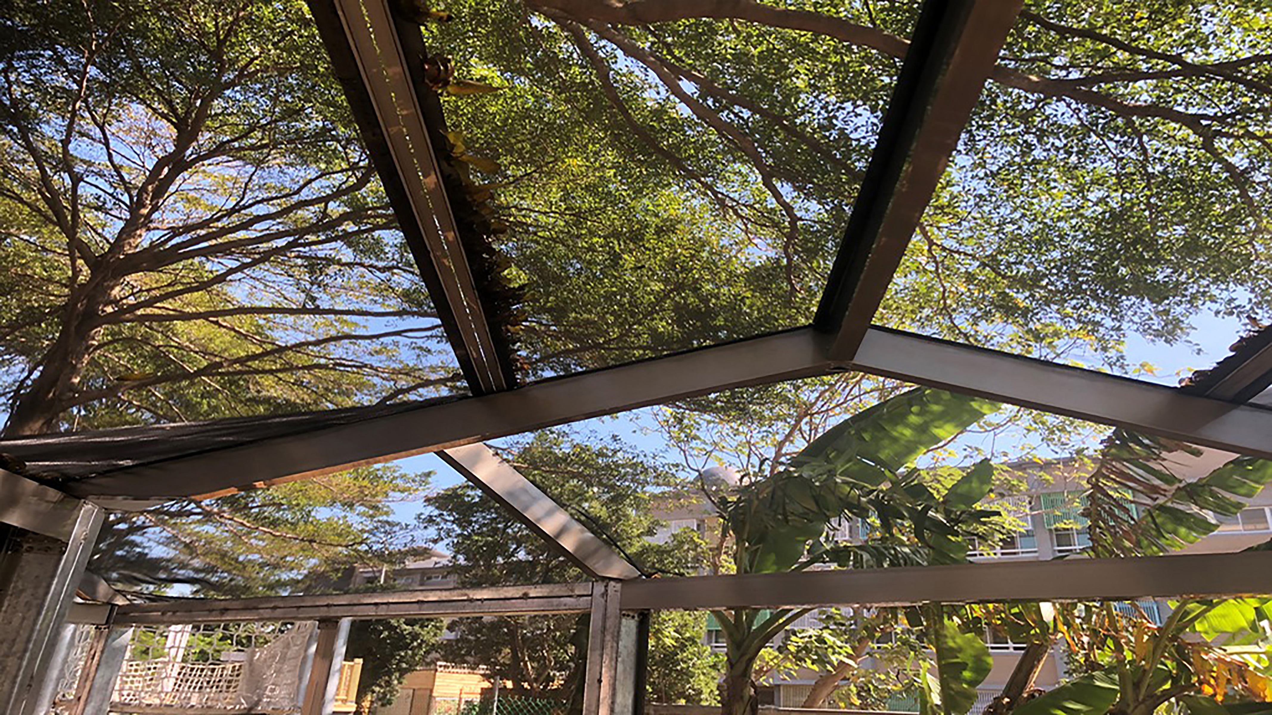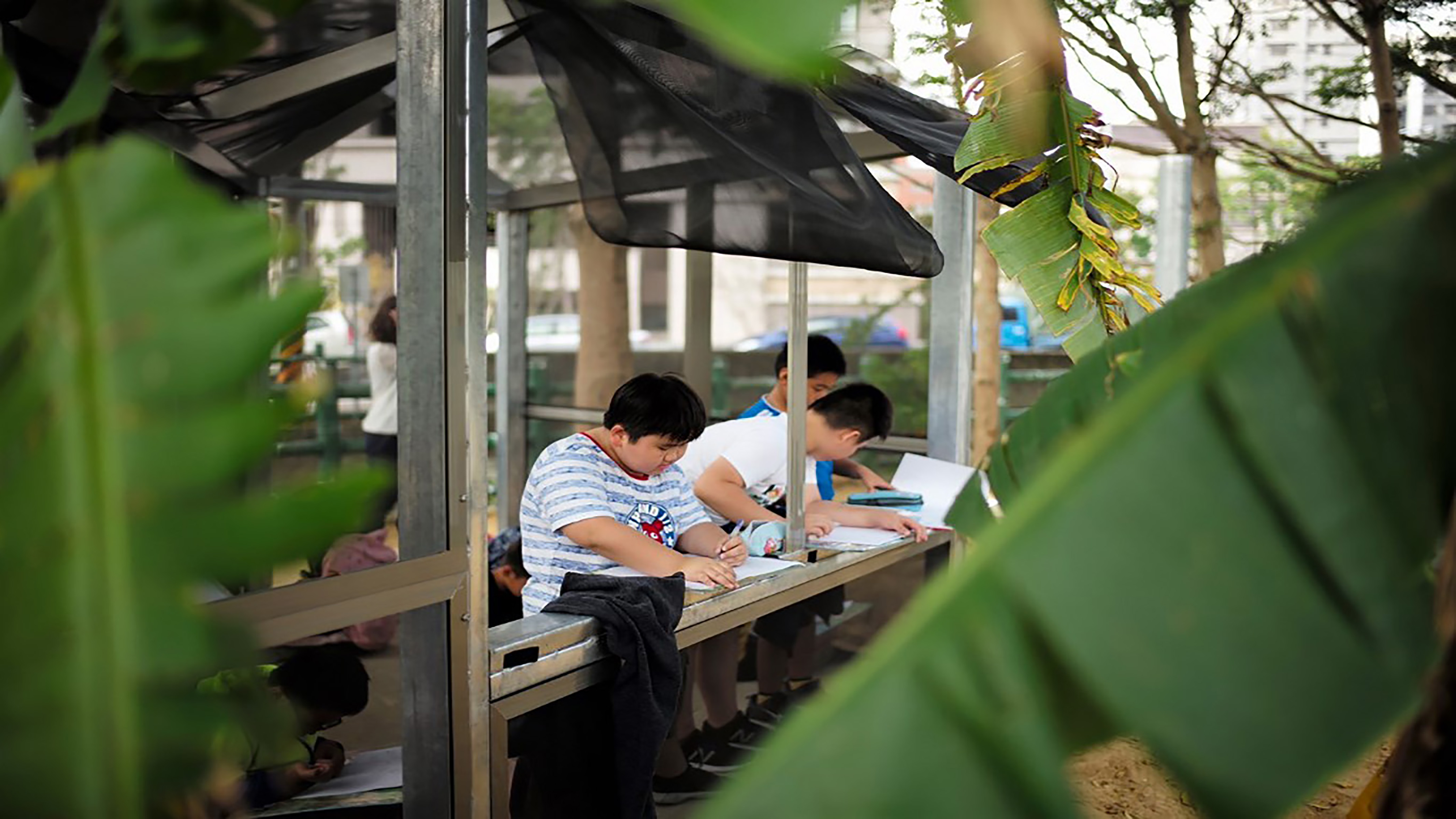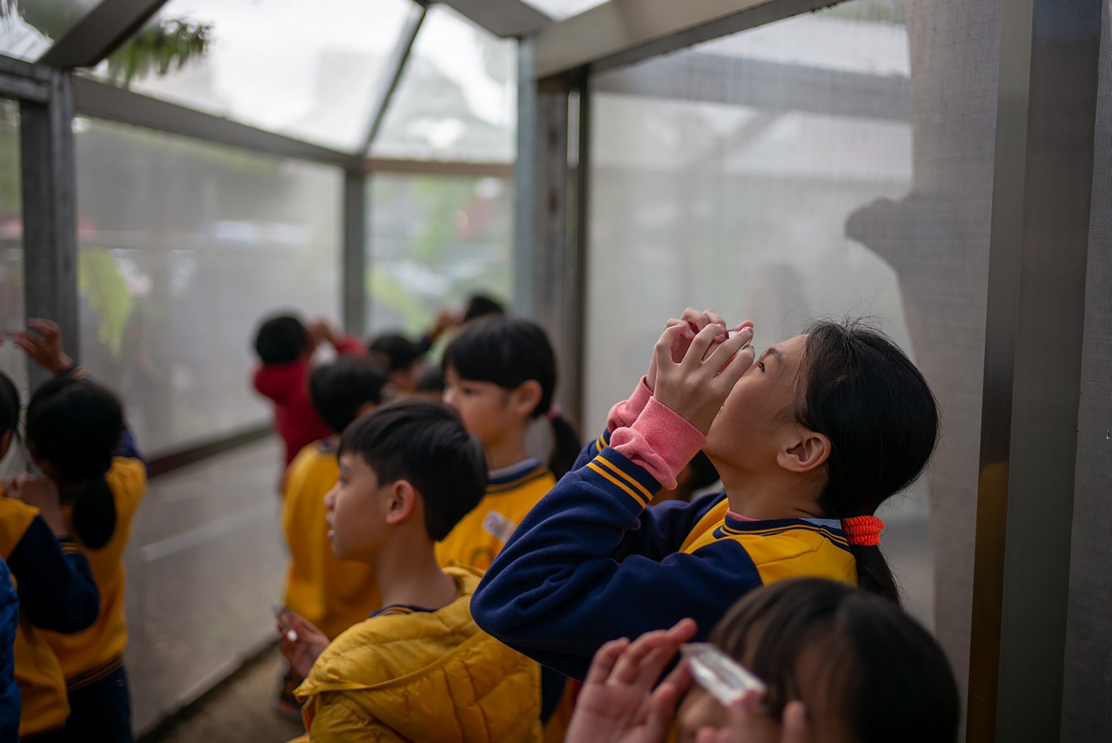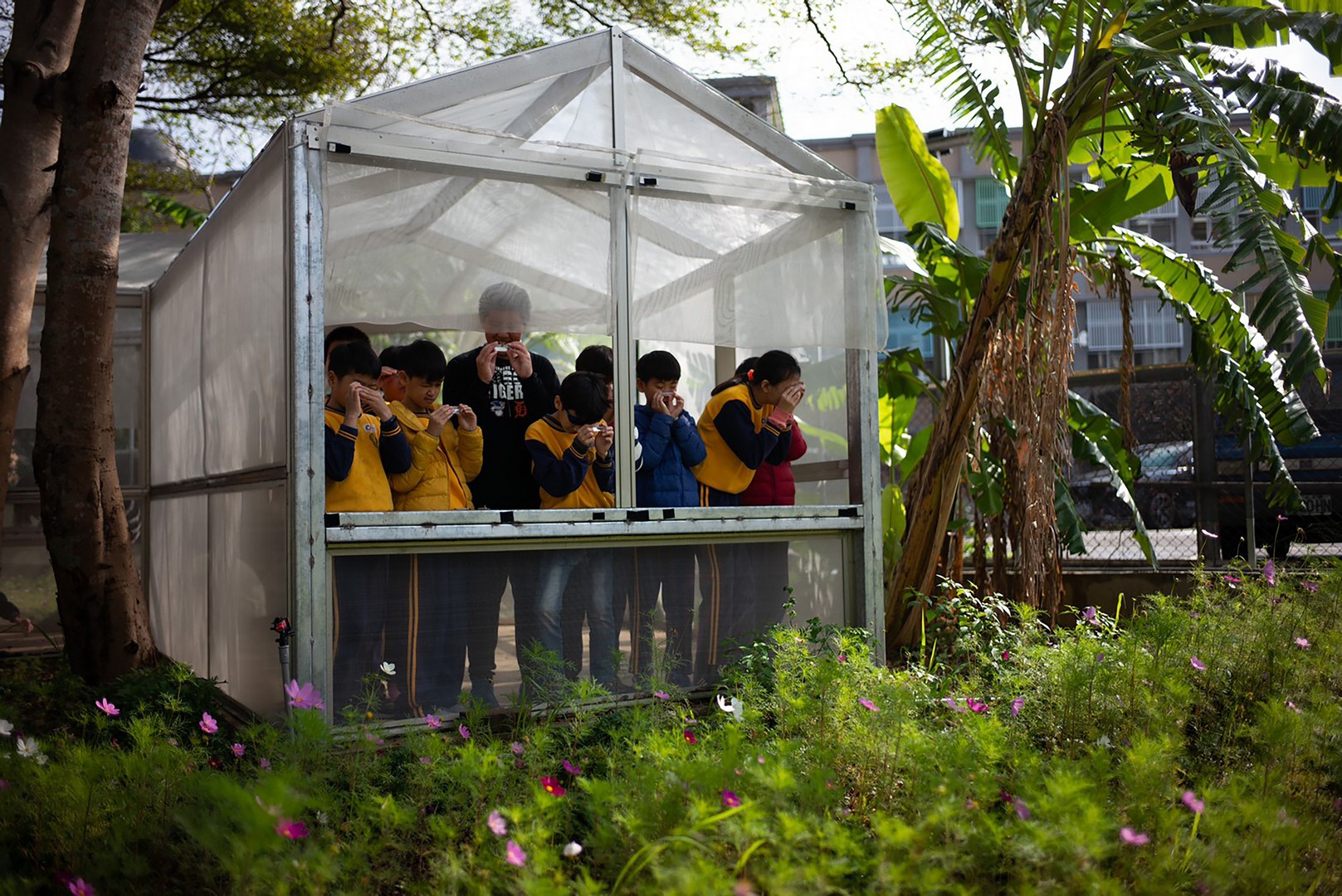 一座翻過圍牆的攀爬場,打破圍牆跟森林的分界,廢棄已久的農舍空間再度活化,意外圈起師生共享的學習空間,融入觸覺、地景、高度的營造,使孩子們從校園的日常接觸中,展開以學校為中心的田野調查課程與各項課程的銜接,增加學童的在地文化涵養,使師生對校園生活有了不同的體驗,自然而然地培養感性的生活思維。而在新舊圍牆中間,仍有一塊種有欖仁樹及芭蕉樹的畸零地,其中蓋有一間鋼構農舍,原來僅作為農具的儲藏,後因應師生需求將之改造為閱讀小教室。以忽隱忽現的細網覆蓋四面,營造白天與夜晚不同的穿透感,並於周邊重新種植香草花卉,降低蚊蠅的孳生。小屋隱約帶點神祕的色彩,扮演校園角落學習的秘密基地,成為白天停車場望向校園的明亮焦點,其高穿透感的小屋,提供學童生態與光影變化的觀察,在屋內寫生畫下芭蕉樹的婀娜身影,紀錄心靈深處的觸動感。