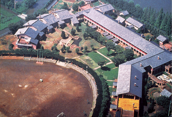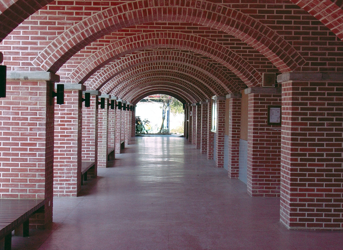 3棟狹長的校舍縱向並排,校舍之間是2個細長的庭園。因此校舍可以從東西兩面採光,以及在教室兩旁設置走廊。