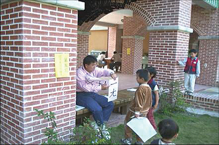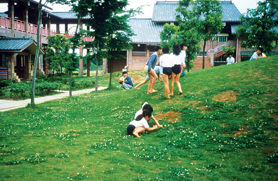 學童們打赤腳,所以從校舍的任何一處都是能自由進出的庭園。