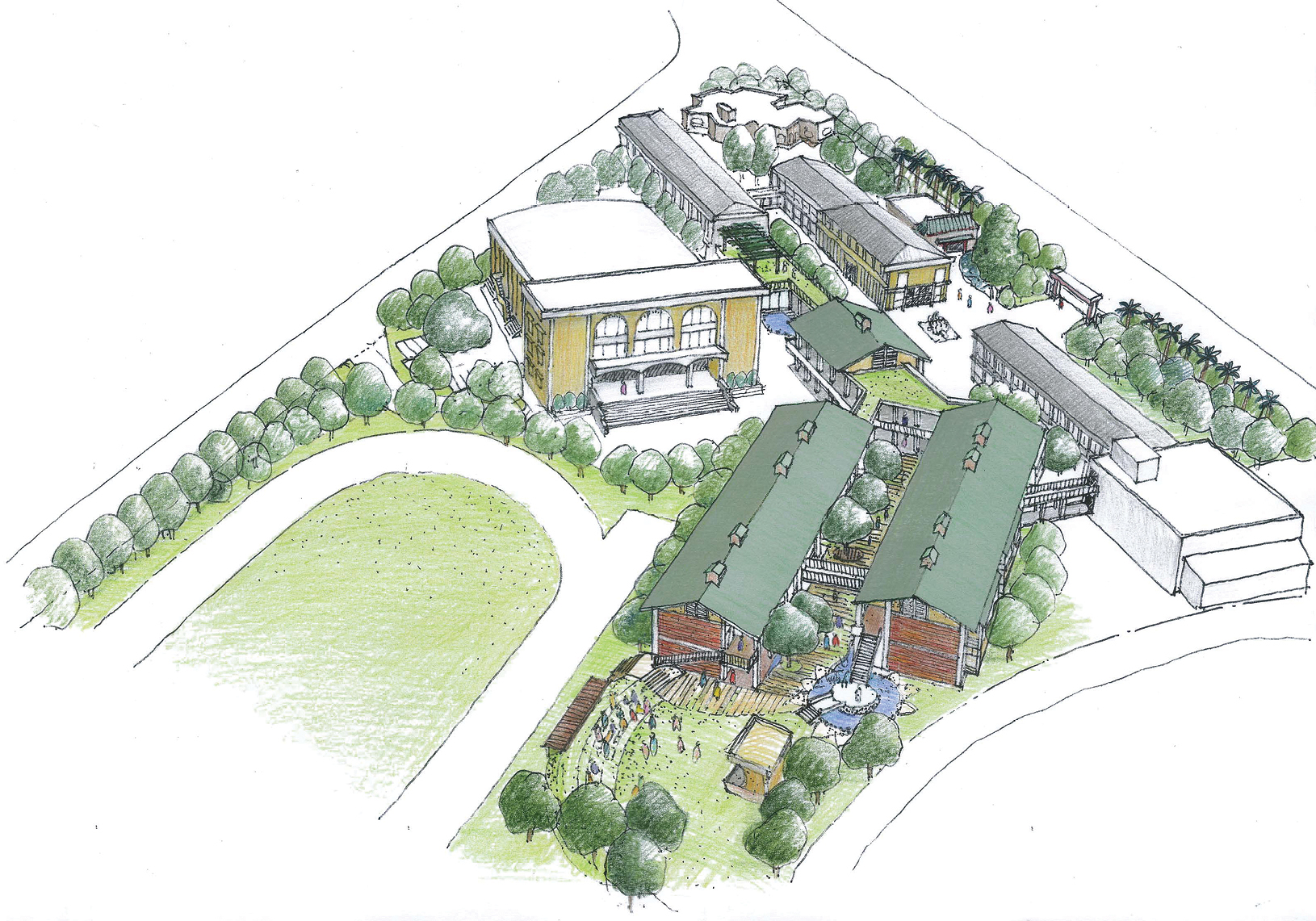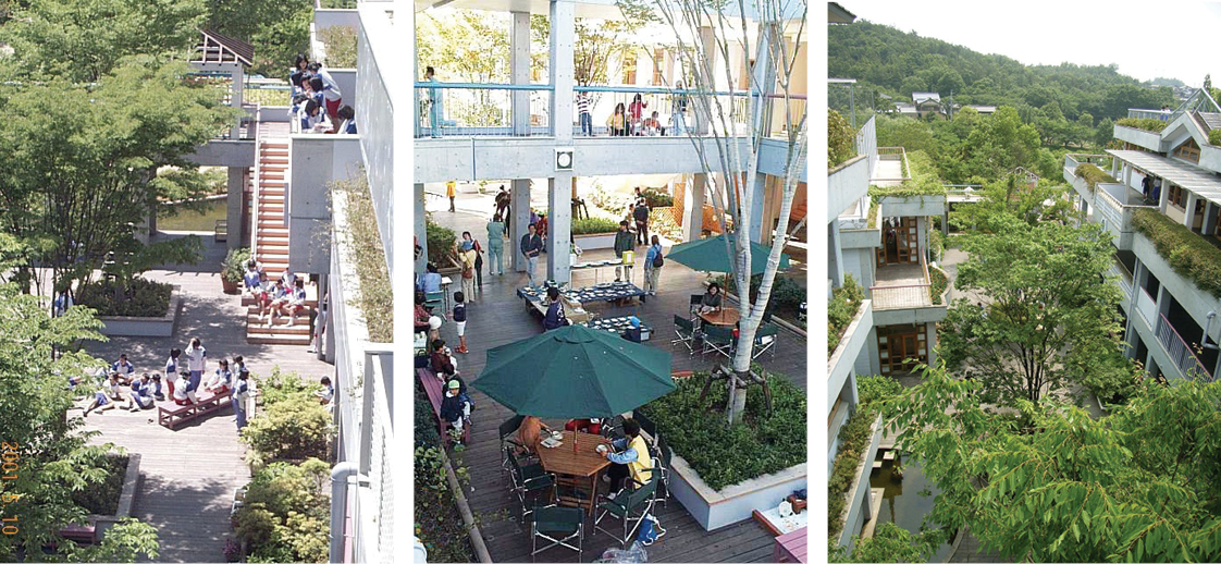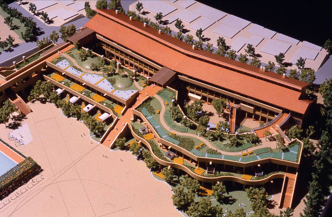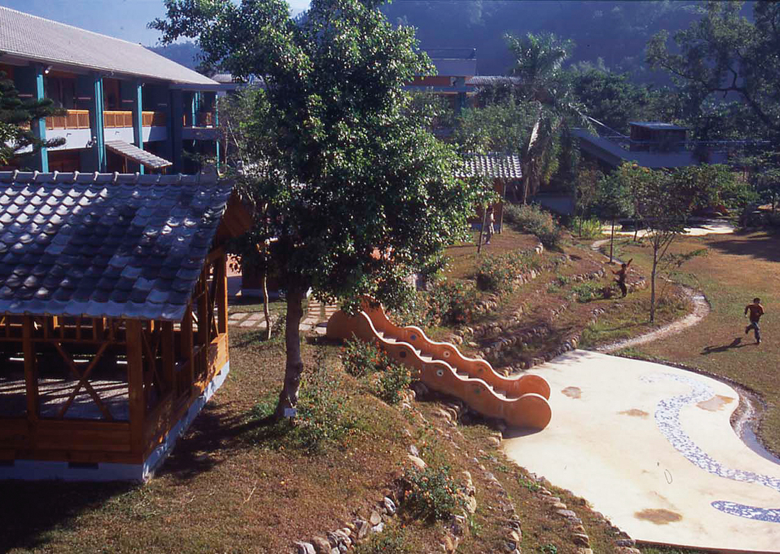 重建後的學校成為水與綠的樂園。教室前方設有水池與小河,樹林中也有小河流淌。校園內設有上庭、下庭、階梯、草地大廣場與雨天時可當操場使用的半戶外廣場。