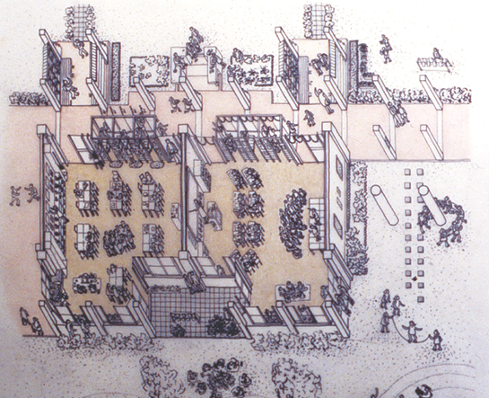 班會、授課與聚餐都在此舉行。中庭四周是半戶外的迴廊、露台與通往樓上的外部樓梯,彷彿露天劇場的座位。
