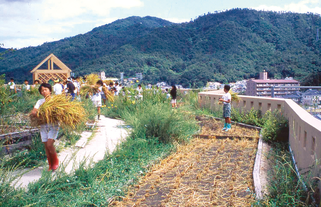 3、4年級班級前方的庭園是「空中夢想農園」,由5年級生來負責照顧。熟悉農事的老練農夫從插秧到收成,全面指導學童。農作物則是挑選易於栽培的糯米。收成、乾燥、脫穀之後,舉辦全校親子搗麻糬大會。土地是生命的源頭,豐收的來源。陽光賦予農作物與日漸成長的學童能量。