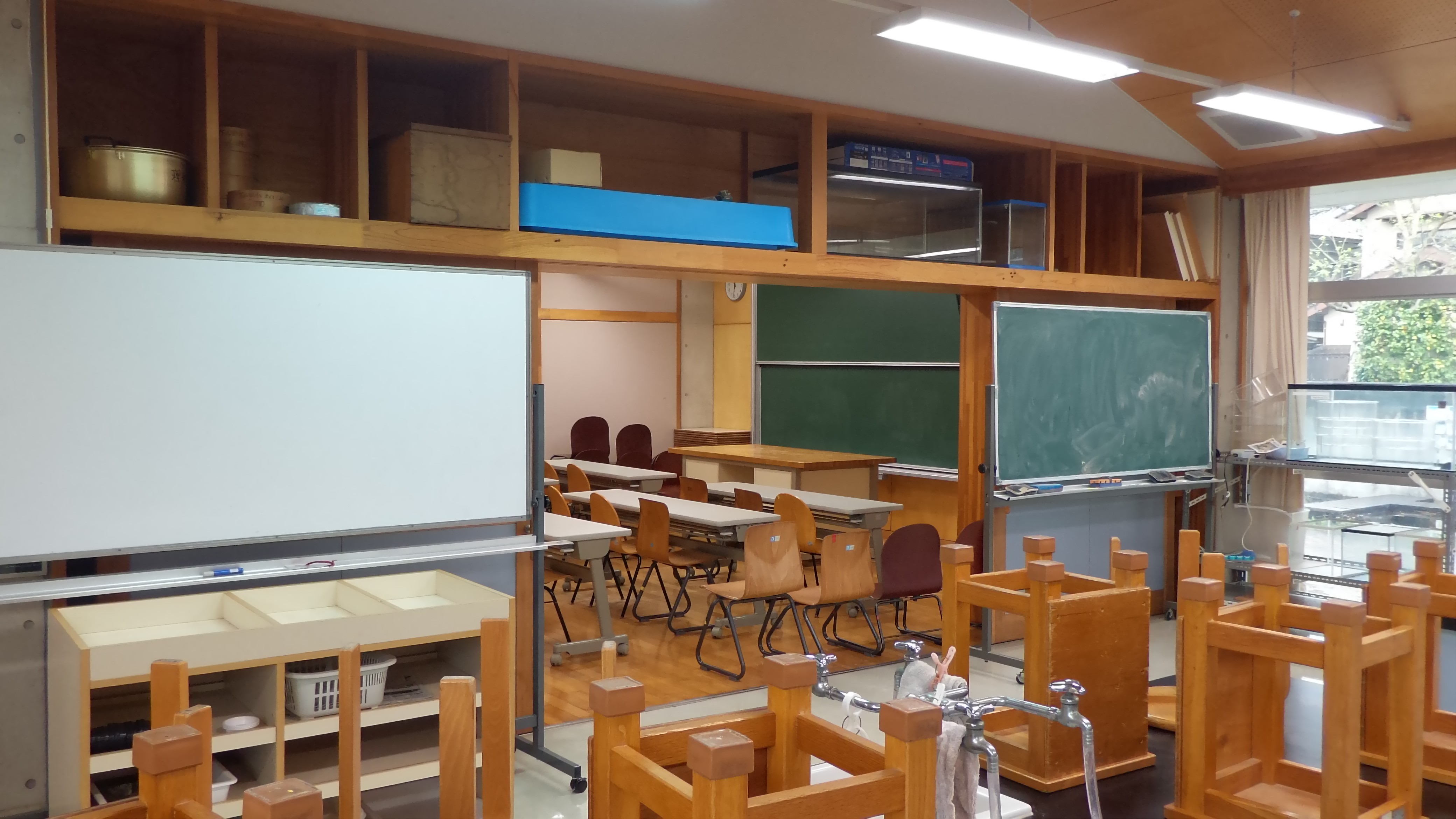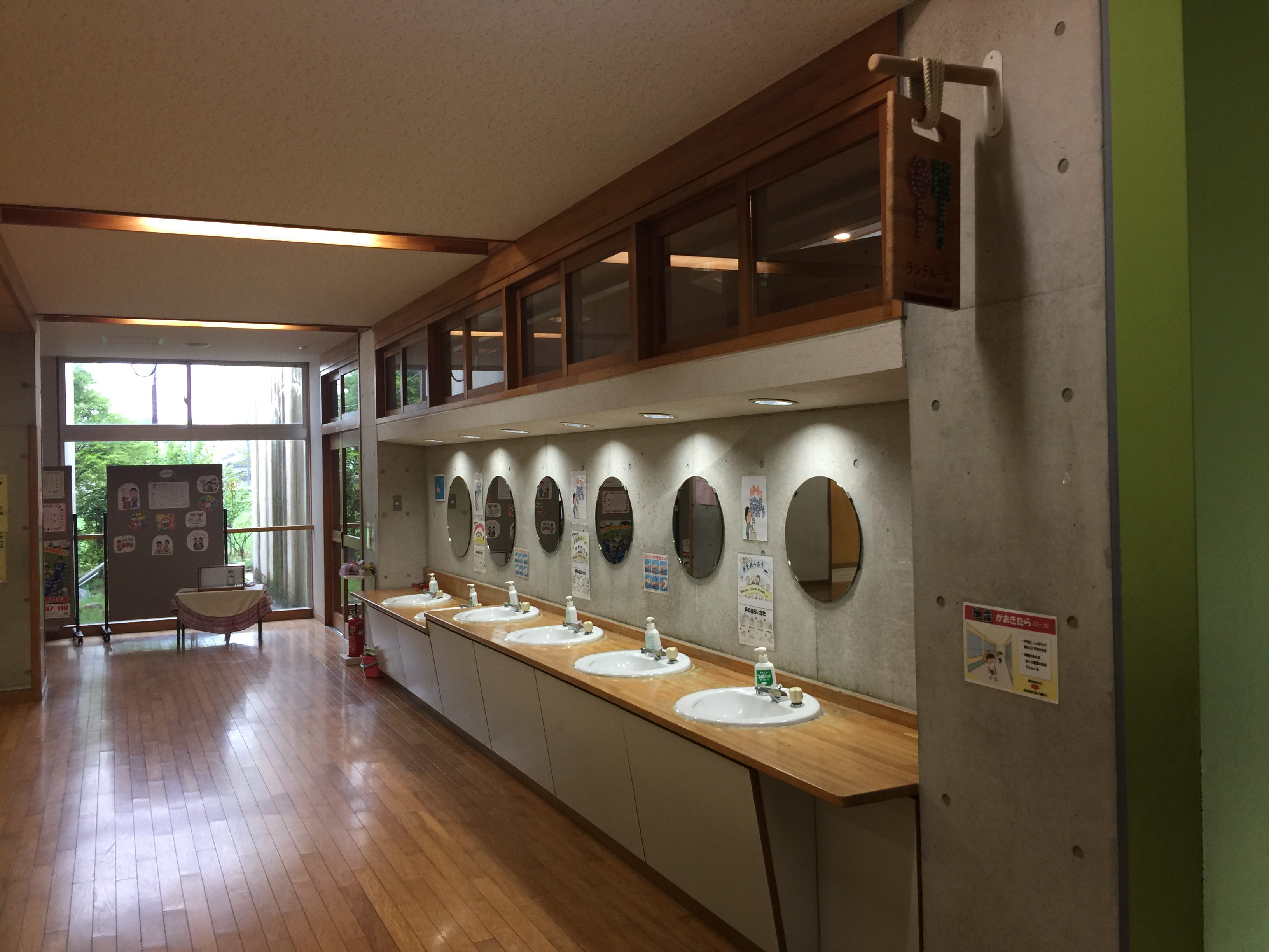 在校內面向農田的走廊,設計了許多不同形狀的玻璃窗,藉由方形或圓形的玻璃窗,自然巧妙的框出窗外美景。教室外懸掛著以切菜砧板所做的指示牌,結合生活用具,運用圖形化的設計,讓孩子能欣賞不同材質所產生的質感。教室中不單單只有傳統的書桌、椅,透過開放式的長廊與寬闊的工作空間,老師與孩子們可依據不同的課程規劃,改變教室的樣貌,來產生新型態的教學活動。
